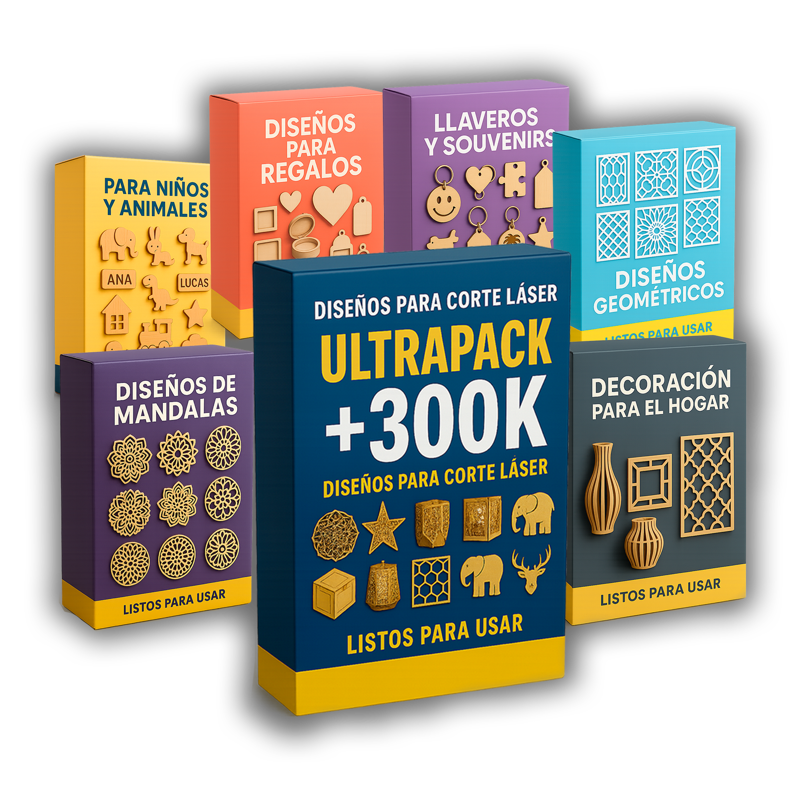 Acceso al pack completo con +300 000 diseños profesionales listos para cortar, personalizar y vender con tu máquina láser, aunque recién estés empezando.